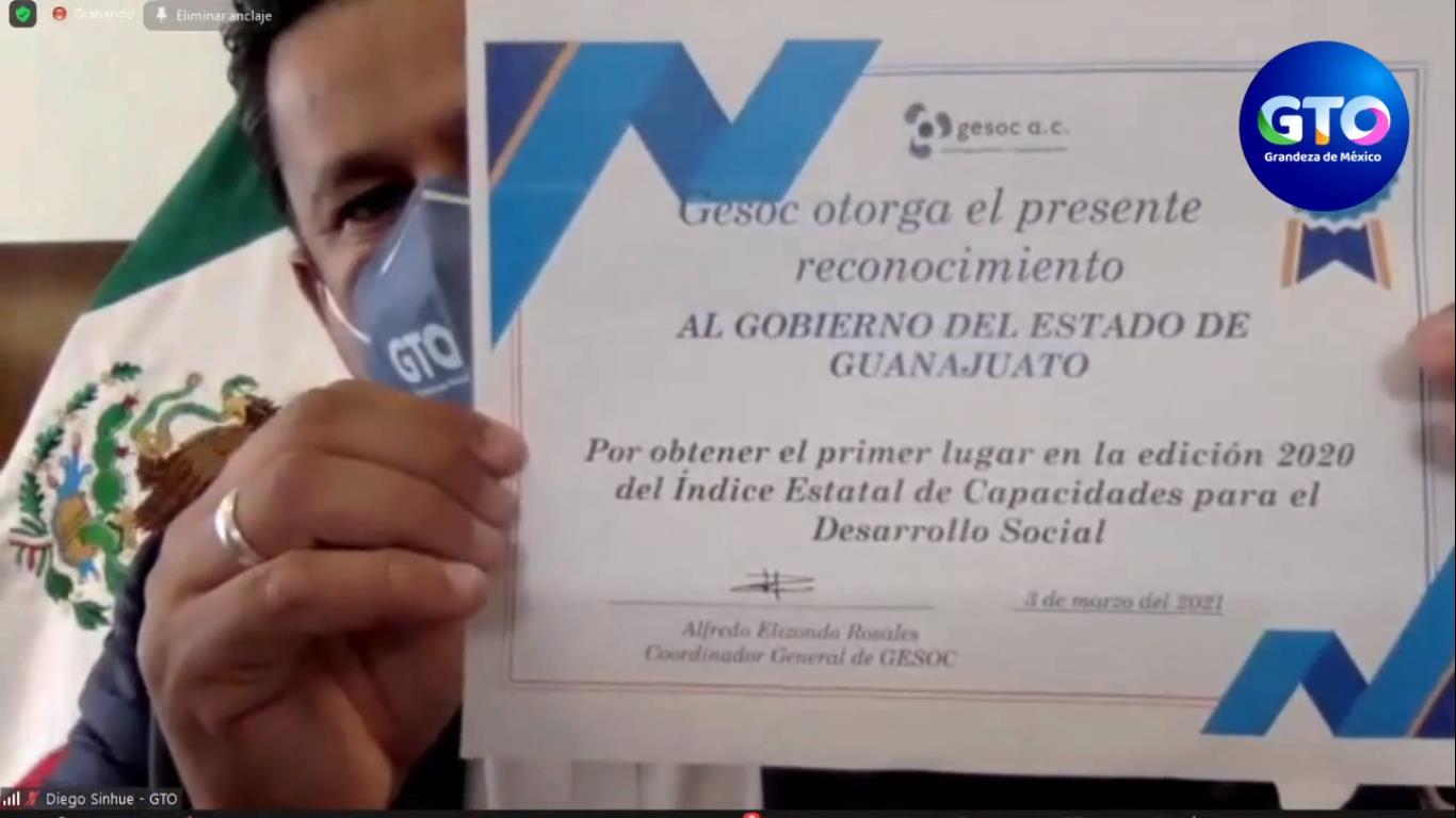 El Gobernador de Guanajuato, Diego Sinhue Rodríguez Vallejo, recibió a nombre de las y los guanajuatenses, el reconocimiento por lograr el primer lugar nacional en el Índice Estatal de Capacidades para el Desarrollo Social 2020.