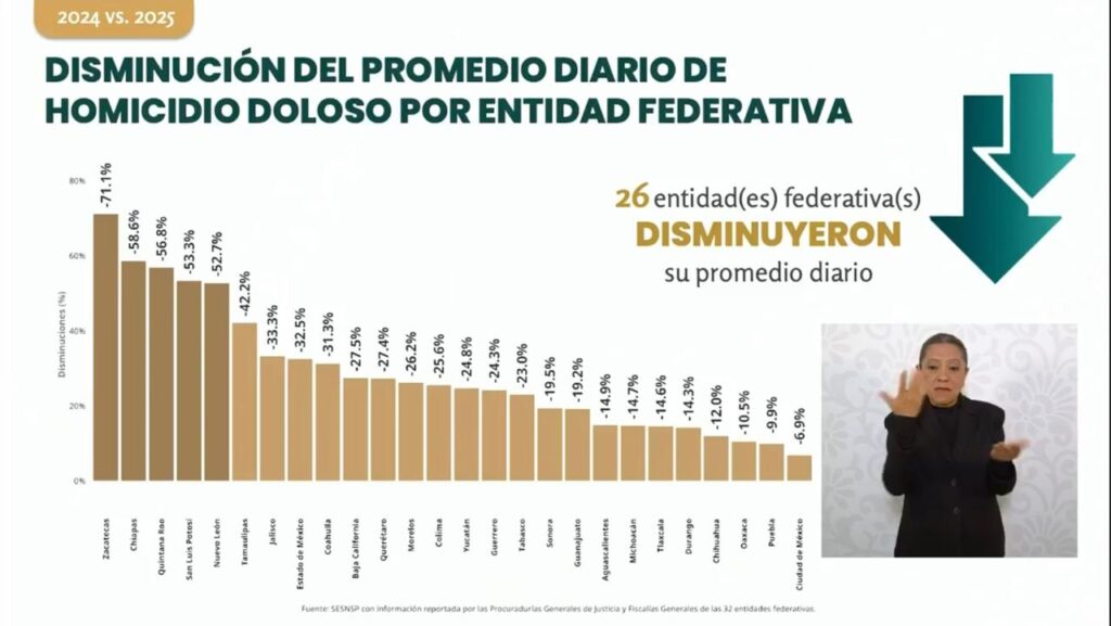 Zacatecas, Zac.– Por segundo año consecutivo, Zacatecas se consolida como el estado más seguro de México, al registrar una disminución del 71.1 por ciento en homicidios dolosos entre los años 2024 y 2025, informó el Gobernador David Monreal Ávila, con base en datos presentados por el Secretariado Ejecutivo del Sistema Nacional de Seguridad Pública (SESNSP) durante la conferencia “La Mañanera del Pueblo”, encabezada por la Presidenta de México, Claudia Sheinbaum Pardo.
